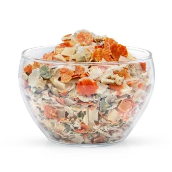Die erlesene Kombination besteht aus Kartoffeln, Karotten, Zucchini, Erbsen, Petersilie, Löwenzahnkraut mit Wurzel und Porree. Durch die sorgsame Trocknung und luftdichte Verpackung werden die wertvollen, natürlichen Inhaltsstoffe von bestem Gemüse und natürlichen Kräutern geschützt. Zudem hält der Mix länger frisch und versorgt Deinen Liebling so mit wertvollen Nährstoffen.